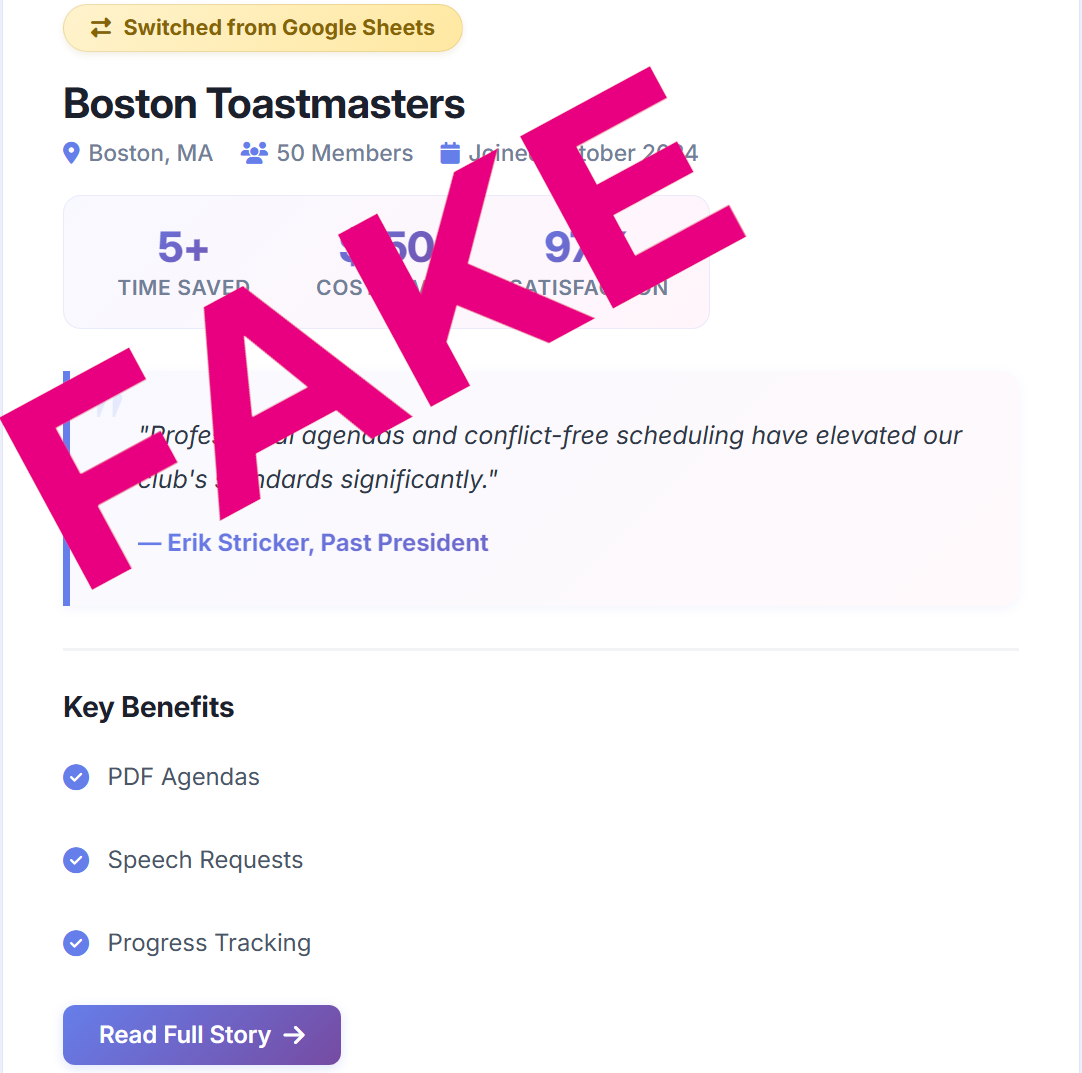 Boston Toastmasters does not publicly endorse any particular software solution and has never used the product that is marketed on this website. We would also like to note that the two most popular software solutions for managing Toastmasters clubs, Easy-Speak and Free Toast Host, are both completely free for clubs to useāand always have been.